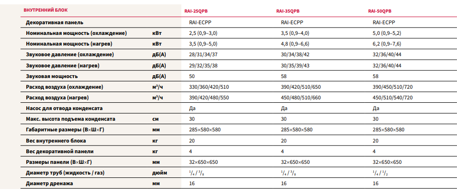 Технические характеристики внутринних блоков касетного типа Hitachi