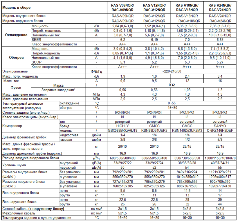 Технические характеристики сплит-систем серии IGC Freddo S DC Inverter