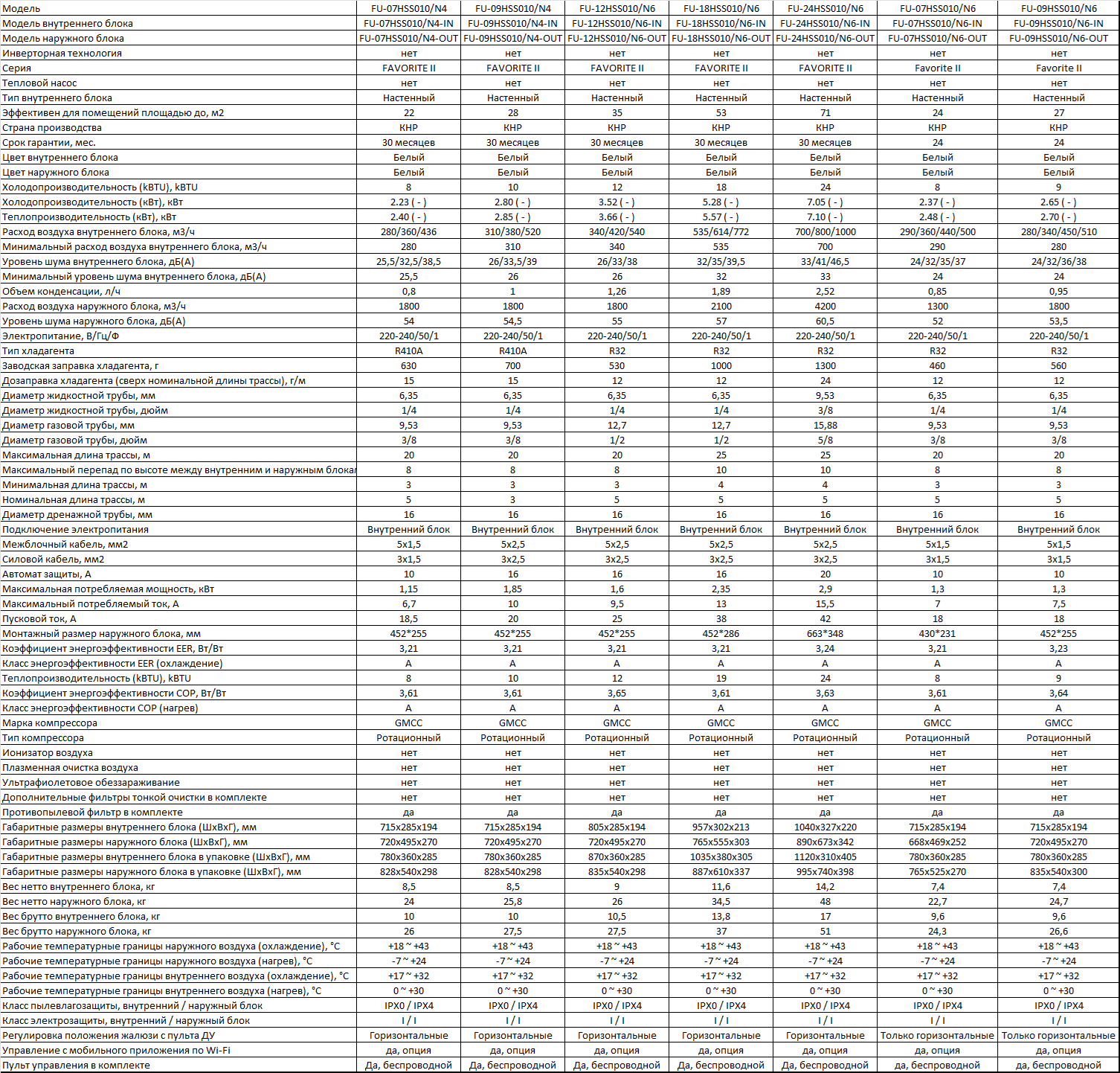 Озонобезопасный хладаген R410A (7 и 9 модели 2024 года) и R32 для остальных моделей.