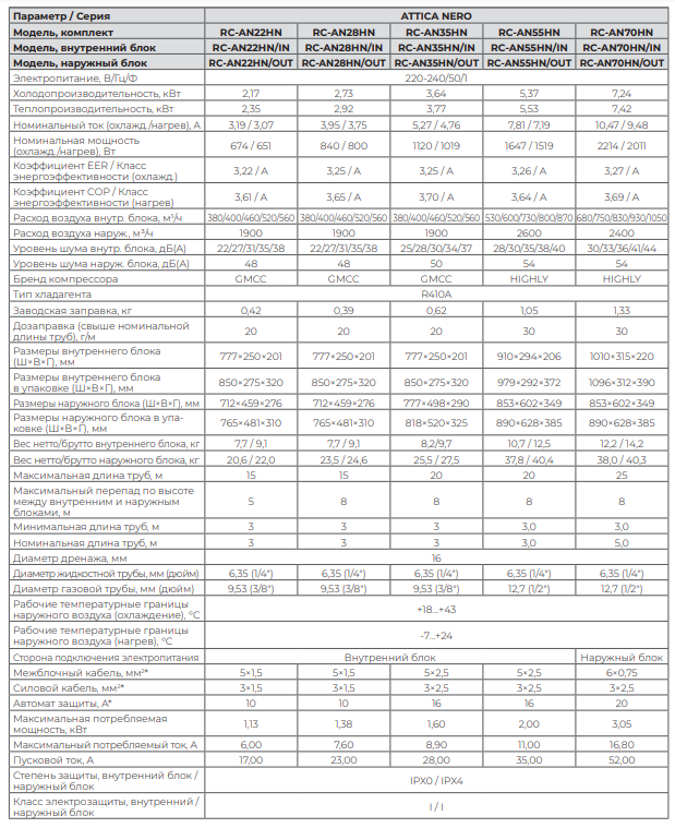 Технические характеристики Royal Clima серии ATTICA NERO