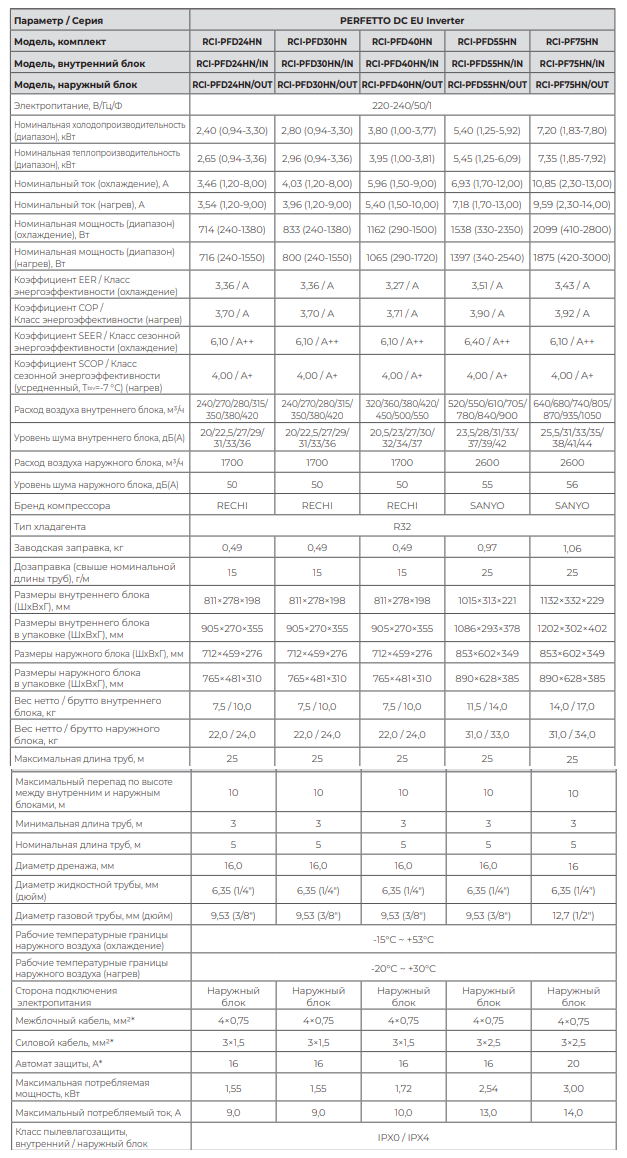Технические характеристики серии Royal Clima PERFETTO DC EU Inverter