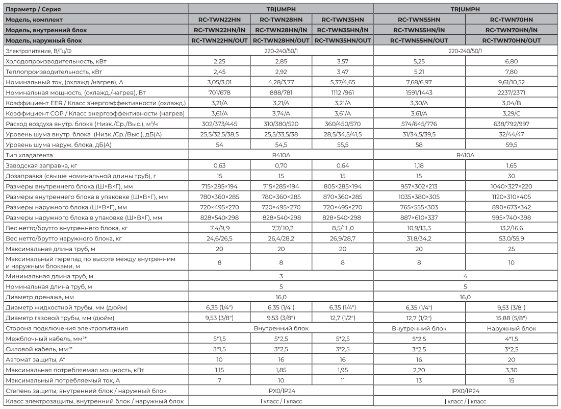 Технические характеристики ROYAL Clima серии TRIUMPH