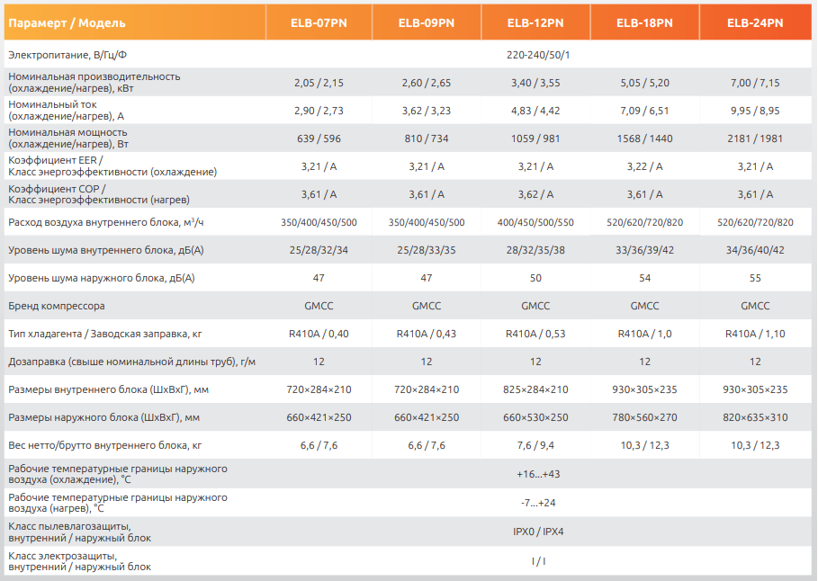 Технические характеристики сплит-систем Ultima Comfort ELYSIUM